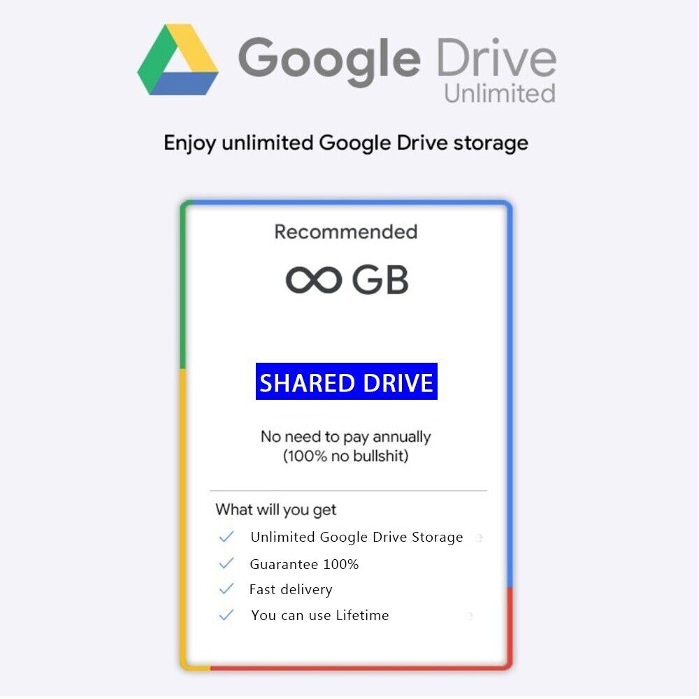 Item description from the seller Google Drive Unlimited Storage NOTE!!! *To Ensure smooth and fast delivery, kindly leave your preferred Gmail address after payment. (Do not share your password with me) * Activation Less then 24 Hours * Share drives does not merge with existing 15GB storage, they are separate drives with unlimited storage * You can use Lifetime Visit Our Store for more great deals!